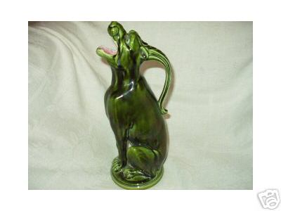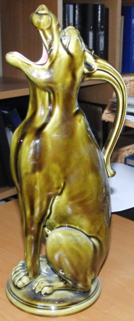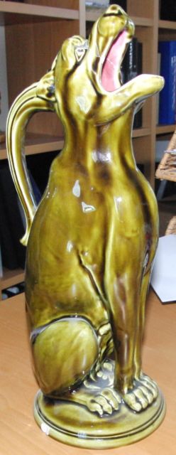 Description : Cruche en forme de chien assis; la tête dressée et la gueule ouverte. Forme proche d une gargouille médiévale