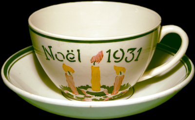 La plus ancienne que nous ayons trouvée est de 1909. Ecrite en allemand, sur une assiette blanche dont l’aile est décorée avec des branches de houx stylisées et posées au tampon.