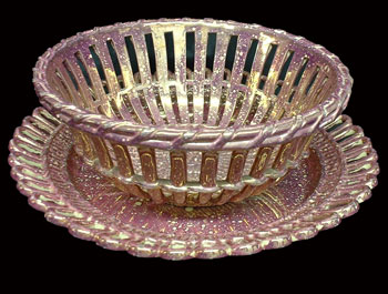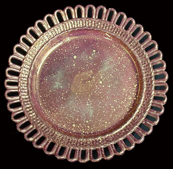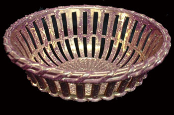 La pièce présentée aujourd'hui est un panier tressé imitant la vannerie, en faïence fine revêtue d'un lustre métallique moucheté dit Burgos, avec son plat rond à aile ajourée. Ce produit existait en trois tailles. Les tailles sont indiquées par des numéros poinçonnés dans la pâte. Les numéros sont inversement proportionnels à la taille. Ce panier ainsi que son support portent le numéro 1, la taille la plus importante: le panier a un diamètre de 22 cm et une hauteur de 9 cm, le diamètre du plat de présentation est de 26 cm.