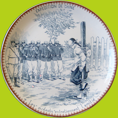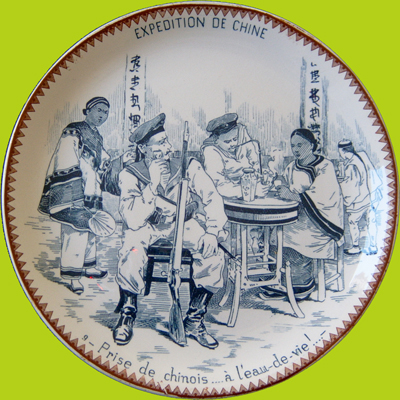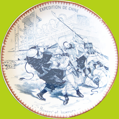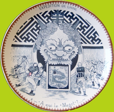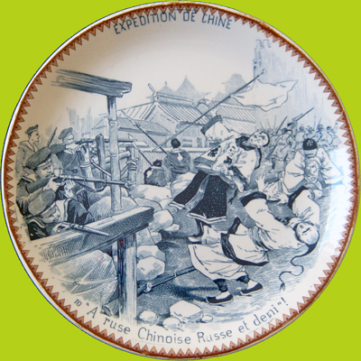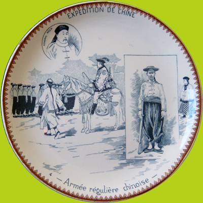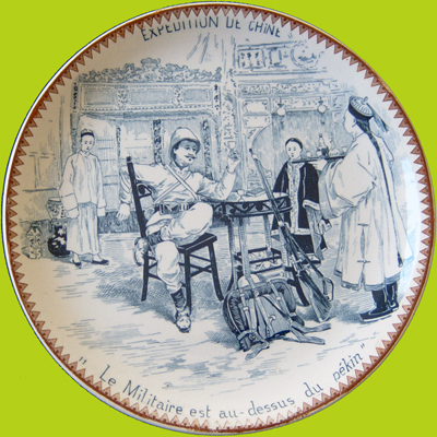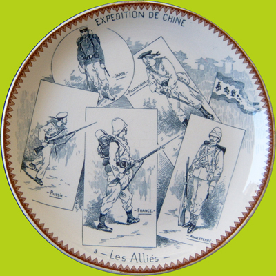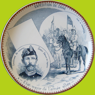 Son ouvrage est paru en 1902, certainement en même temps que la série d'assiettes que nous présentons et qui donne un bon aperçu de la perception par la population française des guerres coloniales et de sa mansuétude pour l'attitude des troupes occupantes (CF les n° 6-8-9-11-12). Les vignettes oublient de rendre compte des mésententes et des désordres dans le commandement des forces alliées. Ceux-ci iront jusqu'à un affrontement entre troupes russes et Zouaves français : les russes avaient confondu l'uniforme très coloré de nos zouaves avec la tenue de l'armée chinoise (Shanhaiguan, le 30 septembre 1900).